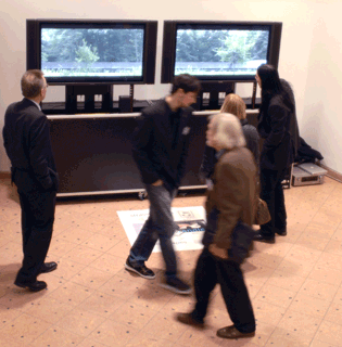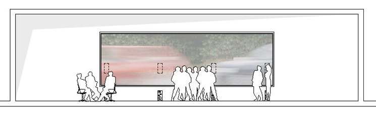 vor dieser leinwand sind vier weitere lautsprecher positioniert. über diese können geräusche wie wald- oder meeresrauschen, spielende kinder, klassische musik oder andere eingespielt werden. diese werden von einem eigens programmierten computer so modelliert, dass sie synchron zu dem anschwellen und abschwellen des verkehrslärms ihre lautstärkeintensität ändern. auf diesem wege werden die verkehrsgeräusche zu soundscapes angereichert und das ganze szenario erhält eine neue stimmung, die - so vermuten wir nach unseren erfahrungen - für den "zuhörer" wohlklingender, atmosphärischer und entspannter ist. der lärm wird aber nicht lauter, da die strassengeräusche nicht überlagert, sondern nur ergänzt werden. um den qualitativen unterschied deutlich zu machen, werden die selben verkehrszenarien hintereinander pur und als angereicherte soundscapes zu hören sein. in der halle 13: